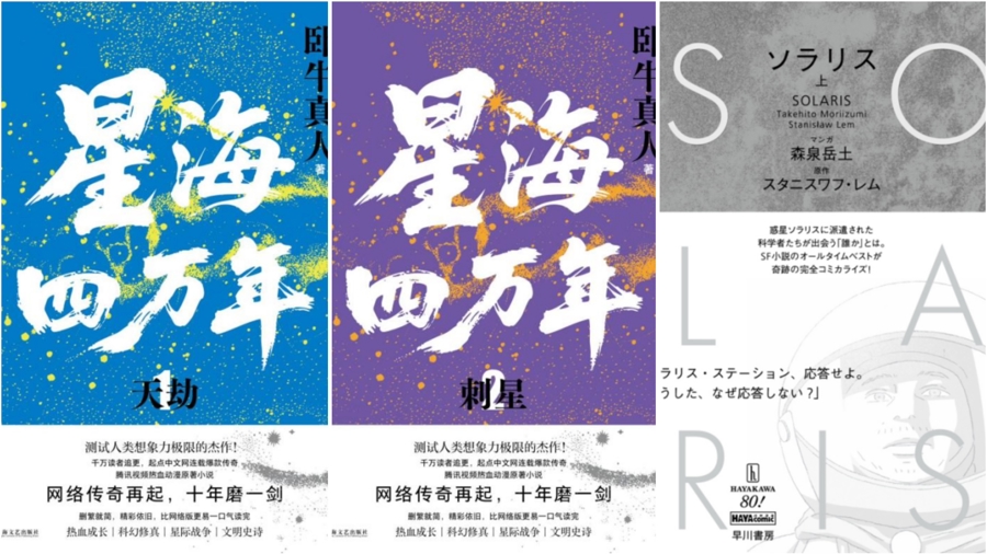 上海文艺出书社出书的《星海四万年1:天劫》《星海四万年2:刺星》,最右为《索拉里斯星(上、下)》原版封面。